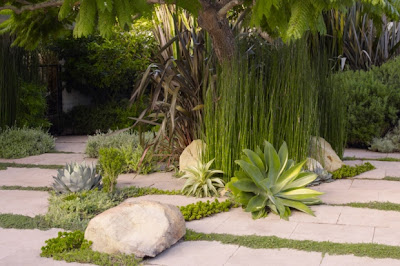 This beautiful modernist garden was designed by landscape designer James Lord from Surfacedesign. A deeper investigation, or, as James Lord says, "an ensuing sense of discovery", reveals unexpected pockets of greenery. The scene is created anew each time James Lord's mother, a "roadside commando" of plant cuttings, brings home a new batch to propagate. So far, she's usurped aeonium and lavender from the South Coast Botanic Garden (where she's a volunteer) and adopted orphaned steel-blue agave pups from the neighbor's yard. "The garden evolves to live," says James, "and lives to evolve."